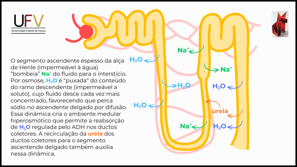 Em contraste, o ramo descendente delgado é altamente permeável à água, por meio de canais AQP1, e praticamente impermeável a solutos. À medida que o fluido tubular desce pela medula, a água sai por osmose em direção ao interstício hipertônico, concentrando progressivamente o conteúdo tubular. O fluxo contínuo de filtrado ao longo da alça permite que esse processo seja repetido ao longo de todo o seu comprimento, promovendo a multiplicação do gradiente do córtex para a papila.