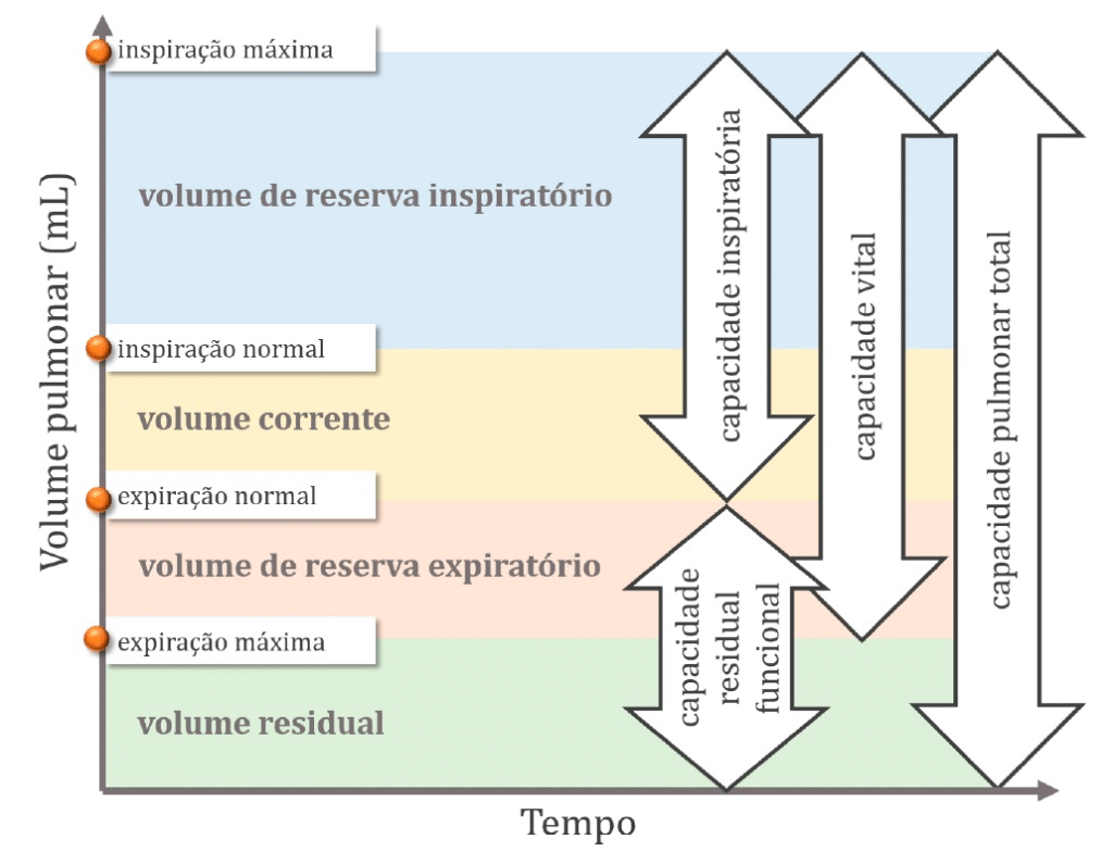 O volume de ar inspirado ou expirado em cada ciclo respiratório normal é denominado volume corrente (tidal volume, Vₜ). Parte desse volume chega aos alvéolos e participa das trocas gasosas, mas uma fração permanece em regiões das vias aéreas que não realizam troca gasosa, conhecidas como espaço morto anatômico.
