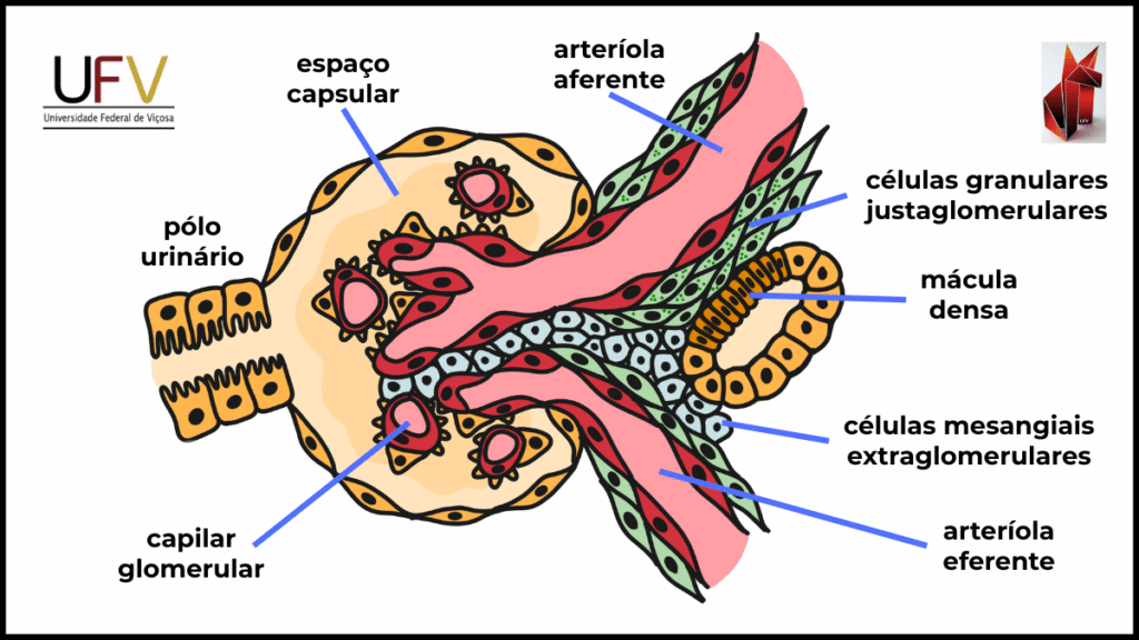 Células justaglomerulares (granulares), localizadas na parede da arteríola aferente, especializadas na síntese e secreção de renina;
